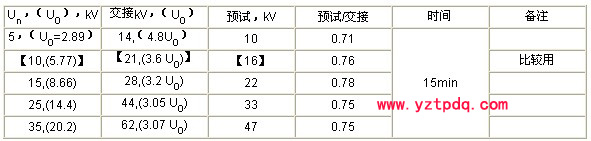 1、綜合國外和國內(nèi)采用的標準,在Un=60kV以下的中壓電纜(3~35kV)其交接試驗電壓均為2U0,預試電壓用0.8×2U0=1.6U0。深入分析,可見交接和預試電壓的具體值是偏低的。它適宜于發(fā)現(xiàn)(擊穿)有絕緣缺陷和存在問題的電纜絕緣。例如:10kV電纜的交接試驗電壓2U0=17.4kV,預試僅為14kV,比最高工作線電壓Um=11.5kV高出不多。這樣的電壓是不能用來檢測正常絕緣的絕緣水平的。因為正常絕緣的絕緣水平相當高,新電纜的出廠交流耐壓也是很高的。