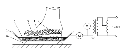 1一被試靴;2一金屬盤;3一金屬球;4一金屬片