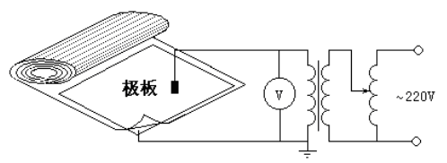 絕緣膠墊試驗接線如圖2所示。試驗時先將絕緣膠墊上下鋪上濕布或金屬箔,并應(yīng)比被測絕緣膠墊四周小200mm,連續(xù)均勻升壓至表8規(guī)定的電壓值,保持1min,觀察有無擊穿現(xiàn)象,若無擊穿,則試驗通過。試樣分段試驗時,兩段試驗邊緣要重合。