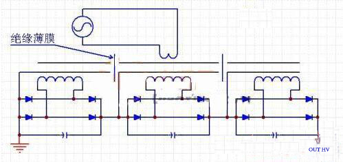 這種方式的電路示意圖如圖3所示。特點是,磁芯是由多段組合而成,每段磁芯之間都用絕緣性能很好的薄膜進行絕緣。每段磁芯都有一個次級繞組。優(yōu)點是:適合較大功率的輸出。變壓器數(shù)量少,只需要一副磁芯。每段次級繞組與磁芯的電壓差小,次級繞組對磁芯的絕緣容易處理。缺點是:磁芯是分段的,結(jié)構(gòu)復雜。磁芯有氣隙,分段越多,等效氣隙越大,磁芯固定困難。