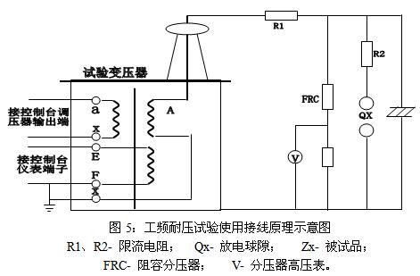 1、TPSBJ系列高壓試驗(yàn)變壓器做工頻耐壓試驗(yàn)使用接線方法見圖5。做工頻耐壓試驗(yàn)前,先根據(jù)試驗(yàn)變壓器的額定容量選擇好限流電阻,(水電阻)的阻值,再根據(jù)被試品需加的高壓電壓值調(diào)整好放電球隙的球間距,為了提高對(duì)被試品施加電壓的測(cè)量精度,應(yīng)在高壓側(cè)接入FRC阻容分壓器來(lái)測(cè)量電壓。