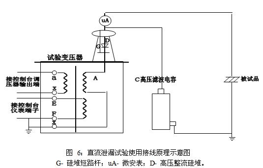 按照?qǐng)D所進(jìn)行的直流泄漏試驗(yàn)接好工作線路。試驗(yàn)變壓器的高壓繞組的X端(高壓尾)、儀表測(cè)量繞組的F 端、試驗(yàn)變壓器的外殼以及電源控制箱(臺(tái))的外殼必須可靠接地。