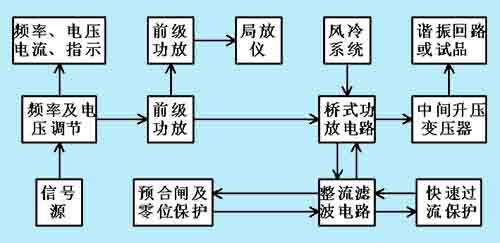 電源裝置的大功率輸出采用逐級放大的原理(見圖)。從zui初的微小功率信號源,經(jīng)過多次放大,實(shí)現(xiàn)大功率輸出,滿足試驗(yàn)需要。