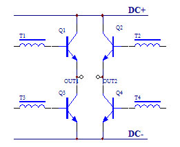 圖中,Q1~Q 4為四個(gè)等效三極管,分別對應(yīng)變電源的四個(gè)橋臂。每個(gè)橋臂由數(shù)千只三極管并聯(lián)組成,并采取了有效的均衡電流措施。正半周時(shí),前級放大信號通過推動變壓器(T1~T4)作用于Q1~Q4三極管的基極,Q2,Q3截止;Q1,Q4導(dǎo)通,電流由Q1至負(fù)載再到Q4形成正弦波的正半周。負(fù)半周時(shí)模擬信號推動Q2,Q3的基極,Q1,Q4截止,Q2,Q3導(dǎo)通, 電流由Q3至負(fù)載再至Q2形成正弦波的負(fù)半周, 從而在負(fù)載上構(gòu)成一個(gè)完整的正弦波。