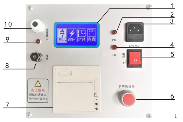 10、高壓輸出端(連接避雷器的一端,當(dāng)開始測量時,此端輸出直流高壓,請注意安全!測試前請連接好被試品,請勿空載測試!)