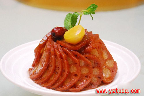 蜜餞捶藕為揚(yáng)州寶應(yīng)十大名菜之首,曾載入清宮御食譜。它是用荷藕、糯米、蜜餞、白蓮為主原料,配以青梅、桔餅、蜂蜜等佐料,經(jīng)燜、拍、炸、蒸等10多道工序制作而成。它色澤醬紅,香甜酥爛,素而不淡,濃而不膩,有健脾開胃、生津止渴、減肥降壓、益腎固精之功效。藕片軟糯,食之香甜不膩。