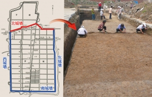 唐羅城北城墻位置確定,留有后期擴(kuò)建跡象。在考古現(xiàn)場,大小兩條探溝清晰可見,在地表向下40厘米左右的地方,一段古城墻遺址輪廓分明,但由于早些年磚瓦廠取土對城墻造成了嚴(yán)重破壞,僅留下基礎(chǔ)部分。夯窩、城墻磚、基槽……考古人員參照史料以及現(xiàn)場考古,發(fā)現(xiàn)東風(fēng)磚瓦廠附近為唐羅城東北角,這段東西走向的古城墻確為唐代羅城北城墻東段,而整個唐羅城北城墻東起東風(fēng)磚瓦廠,向西延伸,北折與子城東南角相接,全長1470米。