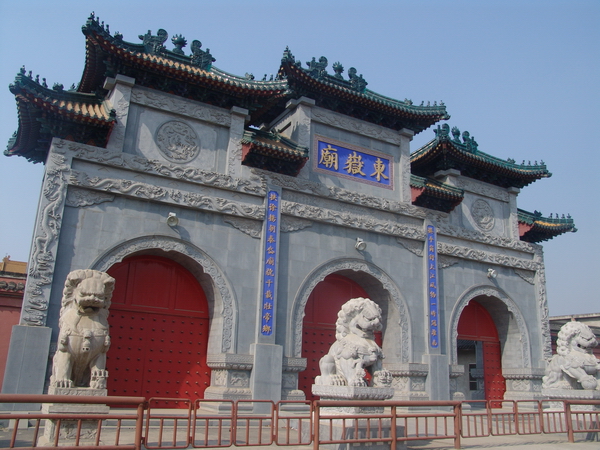 【建設(shè)現(xiàn)狀】恢復(fù)重建的東岳廟占地近30畝,現(xiàn)已建成山門、靈官殿、東岳寶殿、客堂、齋堂、鐘鼓亭等。山門于2006年10月完工,總投資100多萬元,在全國來說都不多見。山門兩側(cè)建有城隍殿、客堂、齋堂等配房。前殿(靈官殿)落成于1999年,內(nèi)部供奉道教靈官祖師(王靈官)以及青龍、白虎、朱雀、玄武四大神像。主體工程東岳寶殿建成于2003年,總投資600多萬元,正面懸掛的巨幅牌匾由已故全國道協(xié)會長閔智亭道長題字。殿內(nèi)供奉東岳大帝、慈航、十大太保等。