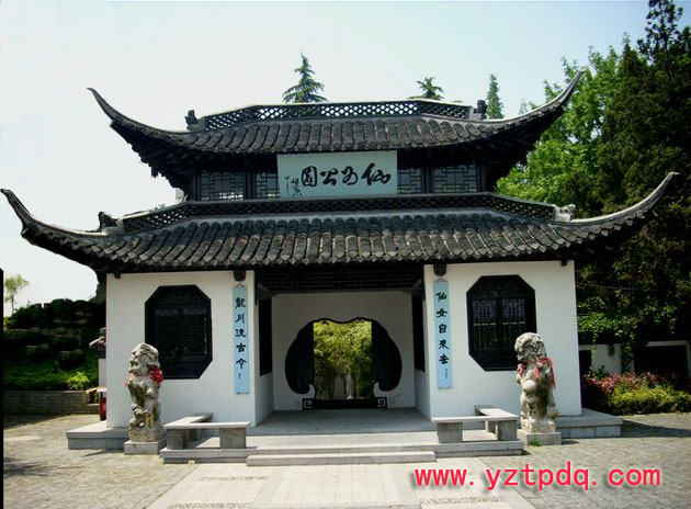 門廳與牌坊同處一條中軸線上,形為如意,游客一入園,即游園如意。進(jìn)門廳先是一小園,園中,以太湖石依地勢堆疊成花臺,幾株翠竹點(diǎn)綴其間,恰到好處。園門—亡古篆“游仙”二字映入眼簾。進(jìn)入園門,西部五疊泉,一支“玉液”從假山頂端跌落,出水處似為龍頭。水流不斷,水濺石響,如聞琴韻,泉旁山黃樹綠,溪旁仙女雕像亭亭玉立,淡裝,素裹,冰清玉潔。溪邊綠柳吻水,花木蔥蘢,把仙女映襯得楚楚動人。