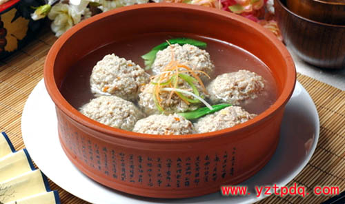 “獅子頭”,即揚(yáng)州話說(shuō)的“大斬肉”,北方話叫“大肉丸子”或“四喜丸子”。據(jù)說(shuō)它的“遠(yuǎn)祖”是南北朝《食經(jīng)》上所記載的“跳丸炙”(《齊民要術(shù).炙法第八十》)。
