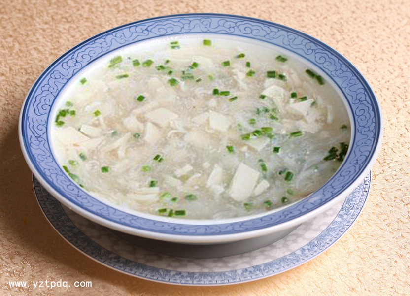 “雪花豆腐”菜名即珠湖雪浪。古代發(fā)明豆腐的是淮南王劉安,關(guān)于淮南王做豆腐的傳說很多:一說劉安在安徽淮南八公山上用大豆煉丹,偶然發(fā)現(xiàn)豆?jié){的凝固現(xiàn)象,逐漸試做出豆腐,在禪內(nèi)秘食,淮南王善于游禪交僧,一日嘗到了和尚們做的豆腐頓覺品味素新,便將豆腐的做法推廣到民間,相傳到各地;還有一說:淮南王劉安非常孝順父母,其母喜吃黃豆,漢高祖十一年時,淮南王的母親生了病,劉安主人把她平時愛吃的黃豆磨成粉,用水沖著喝,并為了調(diào)味放入了一些鹽,結(jié)果就是出現(xiàn)了蛋白質(zhì)凝集的現(xiàn)象,劉安的母親吃了很高興,病也是很快好了,于是鹽鹵點豆腐的技術(shù)便流傳下來。而首創(chuàng)“雪花豆腐”的是揚州高郵人,所以高郵的“雪花豆腐”風(fēng)味獨特。加工切成的豆腐塊細(xì)如飛雪,如珠湖之浪花,它鮮美、香甜、細(xì)嫩、光滑、舒適、暖胃,食后回味留連,越吃越想吃。藝術(shù)大師劉海粟曾為其題詞:“其味無窮”。