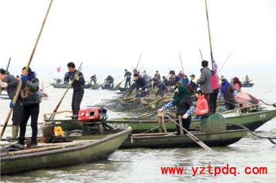 鞭炮聲中,40條漁船緩緩向湖中劃去,每條漁船上都有兩名漁民,一個負(fù)責(zé)劃船,一個負(fù)責(zé)罱魚。船行10分鐘左右,漁民們逐漸把船駛到湖中心。30分鐘后,在“圍長”的號令下,漁民向捕魚區(qū)域行進(jìn)并形成“殺圍”圈,掀起罱魚高潮,一條條碩大的魚兒漸離水面時騰空而起,伴著水花飛濺,一條條活蹦亂跳的魚被漁民擒獲。1小時后,40條船共罱魚800斤左右。一條重38.8斤、長1.3米的大青魚成為本次冬捕“殺圍”節(jié)個頭最大的魚,一舉拿下“頭魚”的稱號。