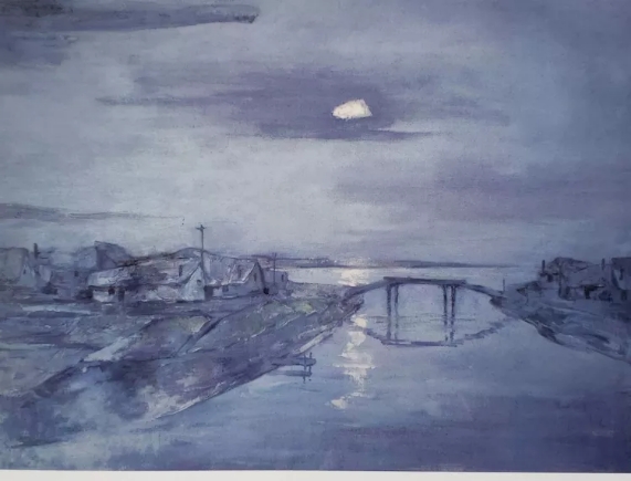 這是家鄉(xiāng)的夜景,冷冷的月亮高高地掛在天上,村莊靜悄悄的籠照在月光下,安詳而充滿神秘,令我神往。這是我畫中的“家”,是我心中的“家”,也是我永遠(yuǎn)回不去的“家”。