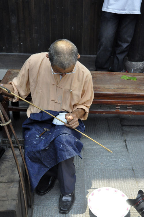 日常使用陶瓷器很普及,因此各地都能看到補碗匠,他們一般沒有固定的攤位,挑一副簡易擔(dān)子,內(nèi)存必要的工具和材料,走街穿巷攬生意做,從那“補碗哦,補碗哦……”吆喝的長腔中,你能發(fā)覺他們不是本地人。操此營生的,以江西老表居多,景德鎮(zhèn)是我國著名的瓷都,產(chǎn)量豐富,由此衍生出“補碗”行業(yè)也是很自然的事情。有一句歇后語:江西人補碗——自顧自,即是從補碗鉆孔時發(fā)出的“口茲口茲”有節(jié)奏的聲響引發(fā)的,它似乎沒有譏諷老表的意思,而是抨擊自私自利的行為。隨著補碗行當?shù)南?,這句歇后語也已淡出江湖。補碗匠大多身懷絕技,小到酒杯,大到幾個人合抱不過來的醬缸,他們都有本領(lǐng)使之“完璧”。有些人家,祖?zhèn)鞯恼滟F瓷器有了裂紋,未雨綢繆,預(yù)先給“補”起來;而尋常人家,生活節(jié)儉,只要“補”比買新的便宜,一只破碗他們都不舍得丟棄,湊合著補一補再用。當然,如今可不這樣了,瓷器磕破了,一扔了之,誰也不會想到去“補”。
