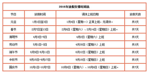 2016年元旦、春節(jié)、清明節(jié)、勞動節(jié)、端午節(jié)、中秋節(jié)和國慶節(jié)放假調(diào)休日期的具體安排通知如下。