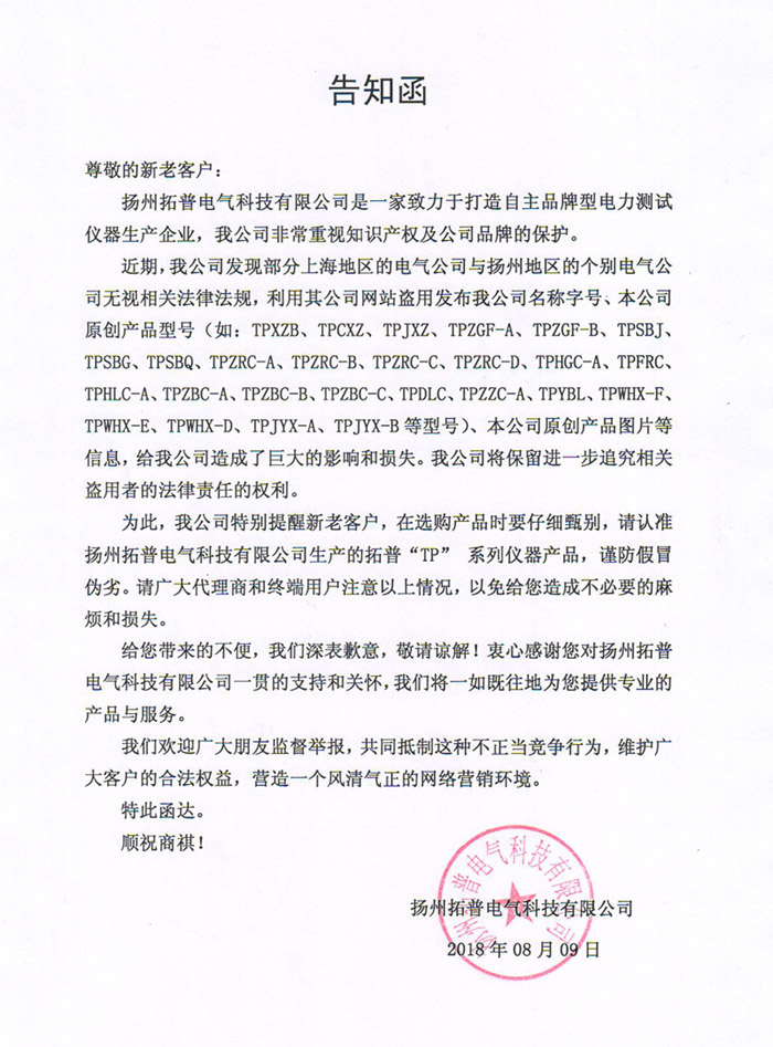 為此,我公司特別提醒新老客戶,在選購(gòu)產(chǎn)品時(shí)要仔細(xì)甄別,請(qǐng)認(rèn)準(zhǔn)揚(yáng)州拓普電氣科技有限公司生產(chǎn)的拓普“TP” 系列儀器產(chǎn)品,謹(jǐn)防假冒偽劣。請(qǐng)廣大代理商和終端用戶注意以上情況,以免給您造成不必要的麻煩和損失。
